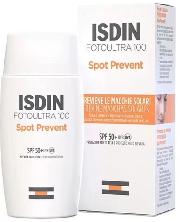 ضد آفتاب اسپات پریونت SPF50+ ایزدین بی رنگ یک ضد آفتاب اسپانیایی با محافظت بالا در برابر هر دو اشعه UVA و UVB آفتاب میباشد. از بروز لک ناشی از آفتاب و بارداری جلوگیری میکند و مناسب انواع پوست مخصوصا پوست های حساس و آتوپیک است. حاوی هیالورونیک اسید بوده و باعث افزایش رطوبت، نرمی و خاصیت ارتجاعی پوست می شود.